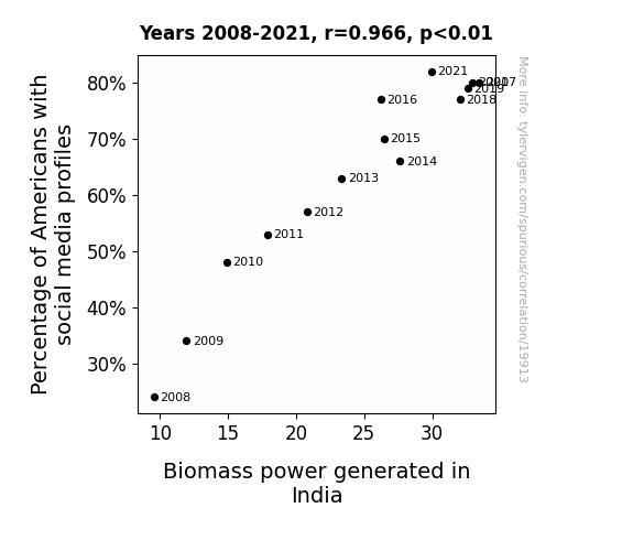 This means 93.4% of the change in the one variable (i.e., Biomass power generated in India) is predictable based on the change in the other (i.e., Percentage of Americans with social media profiles) over the 14 years from 2008 through 2021.