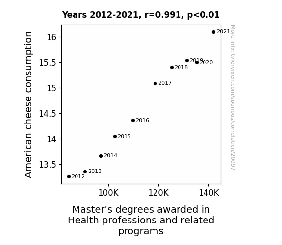 This means 98.1% of the change in the one variable (i.e., Master's degrees awarded in Health professions and related programs) is predictable based on the change in the other (i.e., American cheese consumption) over the 10 years from 2012 through 2021.