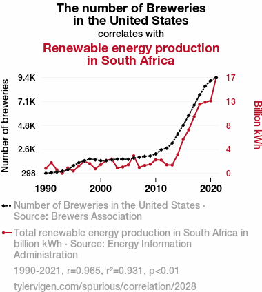**Figure 1**: The figure below illustrates the remarkable correlation between the number of breweries in the United States and the renewable energy production in South Africa. While we cannot pour a beer for every data point, the strong positive relationship is clear, much like the effervescence in a freshly poured pint of ale.