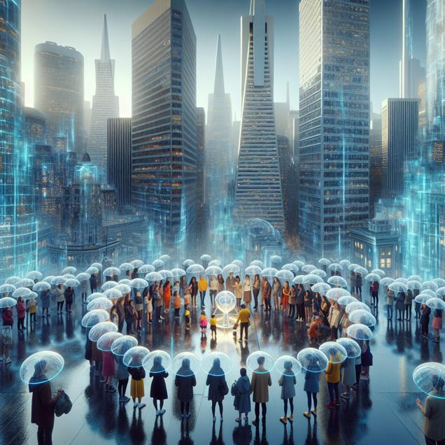 ChatGPT: Generate an image of a futuristic, high-tech setting in San Francisco, where a group of preschool special education teachers from Missouri are huddled under translucent, hi-tech umbrellas. The rain falls like droplets of digital code, shimmering against the backdrop of sleek, glass buildings, creating an immersive and calming atmosphere for their collaborative meeting.