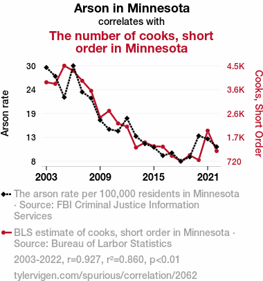 arson, short order cooks, Minnesota, correlation coefficient, FBI Criminal Justice Information Services, Bureau of Labor Statistics, crime statistics