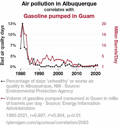 - The spurious research paper: The Gas and the Furious: Uncovering the Link Between Air Pollution in Albuquerque and Gasoline Pumped in Guam