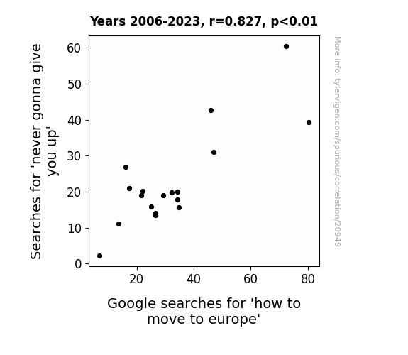 This means 68.4% of the change in the one variable (i.e., Google searches for 'how to move to europe') is predictable based on the change in the other (i.e., Searches for 'never gonna give you up') over the 18 years from 2006 through 2023.