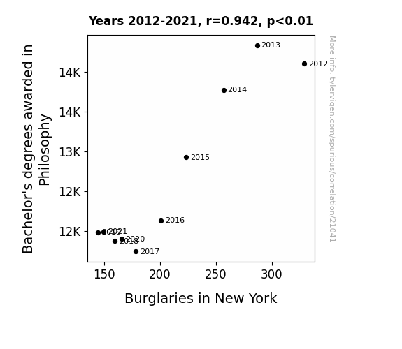 This means 88.7% of the change in the one variable (i.e., Burglaries in New York) is predictable based on the change in the other (i.e., Bachelor's degrees awarded in Philosophy) over the 10 years from 2012 through 2021.