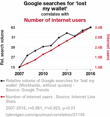 This means 92.3% of the change in the one variable (i.e., Number of internet users) is predictable based on the change in the other (i.e., Google searches for 'lost my wallet') over the 10 years from 2007 through 2016.
