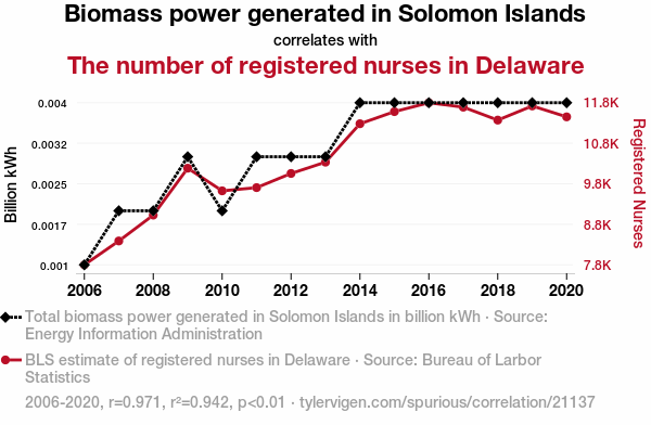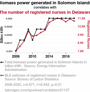This means 94.2% of the change in the one variable (i.e., The number of registered nurses in Delaware) is predictable based on the change in the other (i.e., Biomass power generated in Solomon Islands) over the 15 years from 2006 through 2020.
