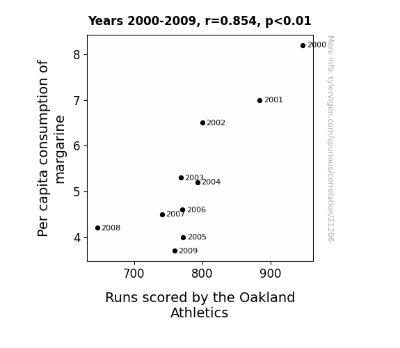 This means 73% of the change in the one variable (i.e., Runs scored by the Oakland Athletics) is predictable based on the change in the other (i.e., Per capita consumption of margarine) over the 10 years from 2000 through 2009.