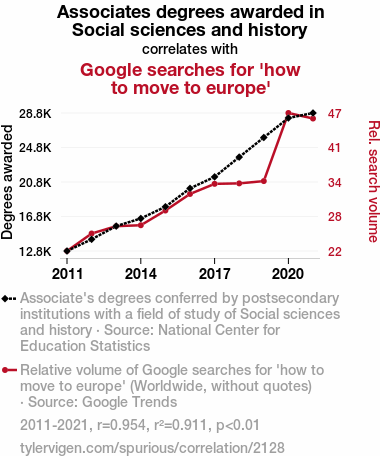 User prompt: Please provide potential search keywords for a paper titled Associates in the Social Sciences: The Prequel to Packing for Europe? with an abstract of In this paper, we delve into the perplexing correlation between the awarding of Associates degrees in Social sciences and history and the sudden surge in Google searches for "how to move to Europe". Utilizing data from the National Center for Education Statistics and Google Trends, our research team found a surprisingly high correlation coefficient of 0.9542625 and a confidence level of p < 0.01 for the years 2011 to 2021. While we approach this topic with the utmost academic rigor, it's impossible to ignore the whimsical potential explanations behind this curious connection. Are aspiring expats seeking historical insights before their big move to the old continent, or are they simply searching for a "social" escape? Join us as we navigate the scholarly realms of Associates degrees and European dreams, all the while letting our academic curiosity lead the way.
