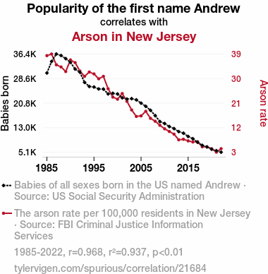 This means 93.7% of the change in the one variable (i.e., Arson in New Jersey) is predictable based on the change in the other (i.e., Popularity of the first name Andrew) over the 38 years from 1985 through 2022.