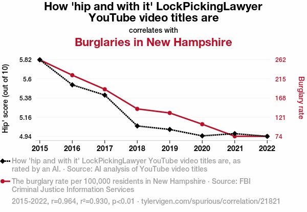 This means 93% of the change in the one variable (i.e., Burglaries in New Hampshire) is predictable based on the change in the other (i.e., How 'hip and with it' LockPickingLawyer YouTube video titles are) over the 8 years from 2015 through 2022.