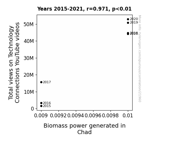 This means 94.4% of the change in the one variable (i.e., Biomass power generated in Chad) is predictable based on the change in the other (i.e., Total views on Technology Connections YouTube videos) over the 7 years from 2015 through 2021.