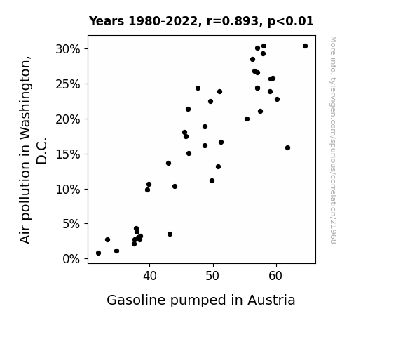 This means 79.8% of the change in the one variable (i.e., Gasoline pumped in Austria) is predictable based on the change in the other (i.e., Air pollution in Washington, D.C.) over the 43 years from 1980 through 2022.