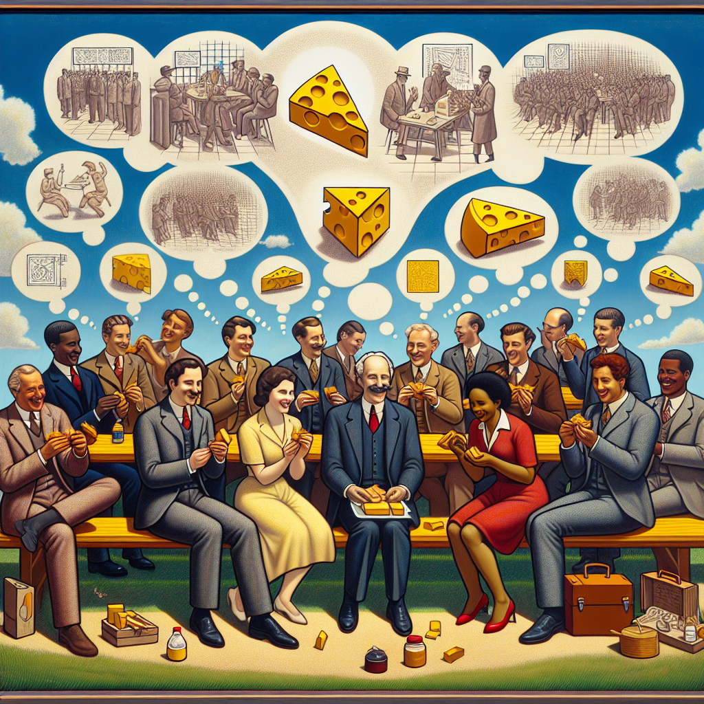 ChatGPT: Picture a picnic in a sunny park, with people enjoying American cheese on sandwiches and crackers. As they savor the cheesy treats, you spot thought bubbles appearing above their heads, filled with innovative ideas. In the background, a line of inventors eagerly present their patent applications to a smiling official, who eagerly stamps each one with approval. The scene exudes a contagious sense of happiness and creativity, with the scent of cheese in the air.