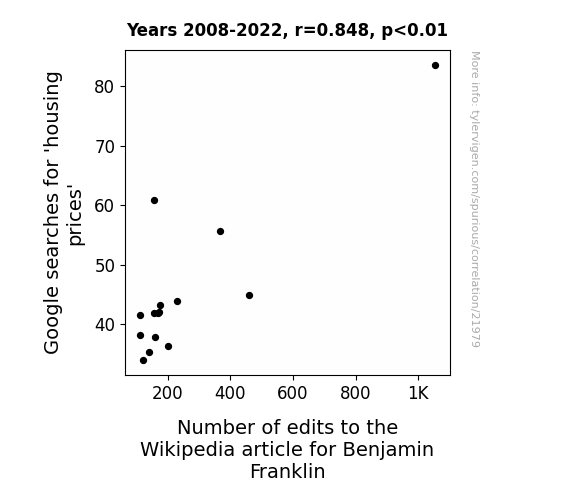 This means 72% of the change in the one variable (i.e., Number of edits to the Wikipedia article for Benjamin Franklin) is predictable based on the change in the other (i.e., Google searches for 'housing prices') over the 15 years from 2008 through 2022.