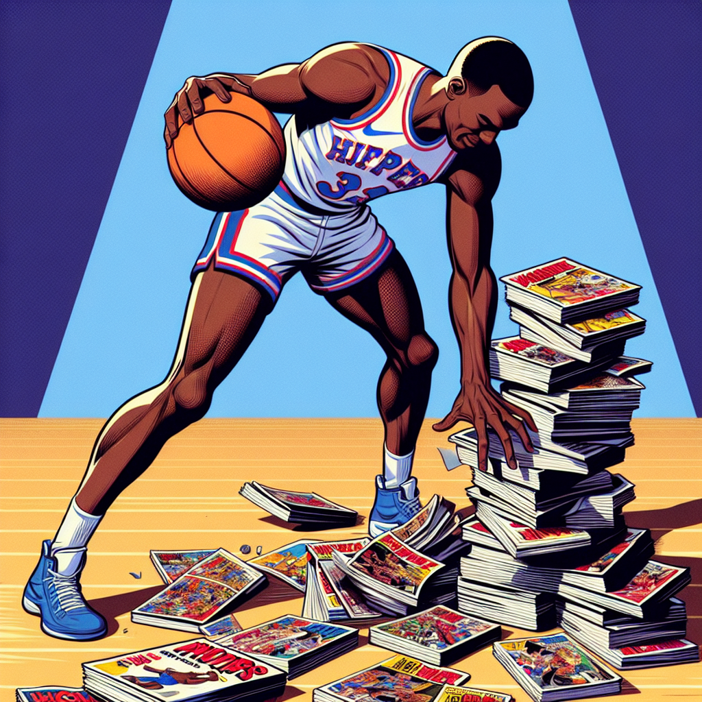 User prompt: Please respond with an image generation prompt that would be likely to create an interesting visual using DALLE-3, using the following style: [ A TIME magazine cover image ] and depicting this scene: Chris Paul accidentally turns the pages of an xkcd comic book too quickly, causing a stack of them to fall to the floor. As he bends down to pick them up, his basketball jersey prominently displays the number of turnovers he had in the Regular NBA season. Keep the visual depiction simple. Do not include any words or speech bubbles.