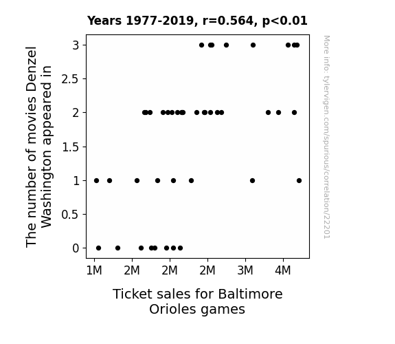 This means 31.8% of the change in the one variable (i.e., Ticket sales for Baltimore Orioles games) is predictable based on the change in the other (i.e., The number of movies Denzel Washington appeared in) over the 43 years from 1977 through 2019.