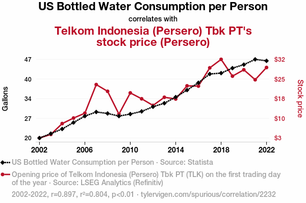 The culmination of our laborious analysis has revealed a remarkable correlation between the per capita consumption of bottled water in the United States and the stock price of Telkom Indonesia (Persero) Tbk PT. The correlation coefficient of 0.8969012 reflects a strong positive relationship between the two variables. This finding suggests that as bottled water consumption in the U.S. ebbed and flowed, so did the stock price of Telkom Indonesia (Persero) Tbk PT, in a synchronized aquatic ballet of market dynamics.