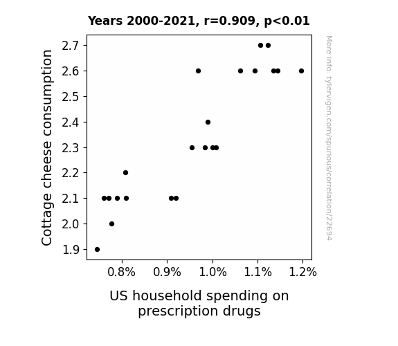 This means 82.6% of the change in the one variable (i.e., US household spending on prescription drugs) is predictable based on the change in the other (i.e., Cottage cheese consumption) over the 22 years from 2000 through 2021.