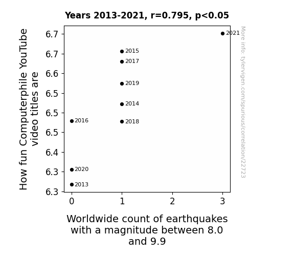 This means 63.2% of the change in the one variable (i.e., Worldwide count of earthquakes with a magnitude between 8.0 and 9.9) is predictable based on the change in the other (i.e., How fun Computerphile YouTube video titles are) over the 9 years from 2013 through 2021.