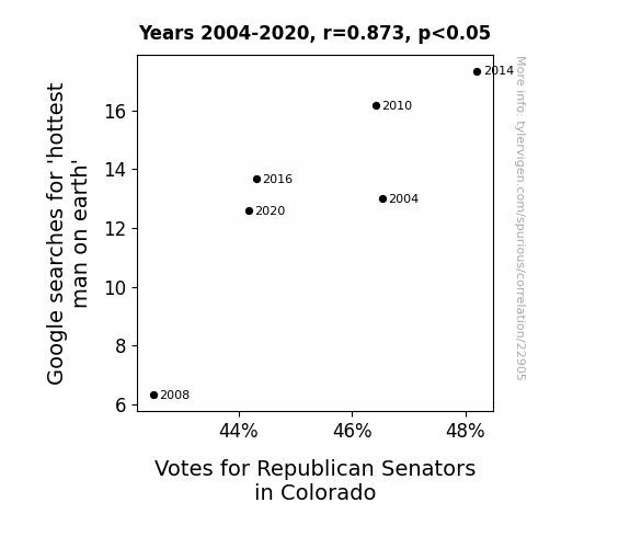 This means 76.2% of the change in the one variable (i.e., Votes for Republican Senators in Colorado) is predictable based on the change in the other (i.e., Google searches for 'hottest man on earth') over the 6 years from 2004 through 2020.