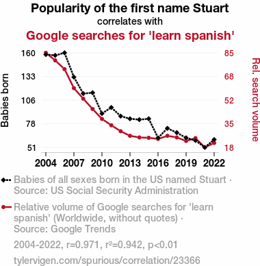 This means 94.2% of the change in the one variable (i.e., Google searches for 'learn spanish') is predictable based on the change in the other (i.e., Popularity of the first name Stuart) over the 19 years from 2004 through 2022.
