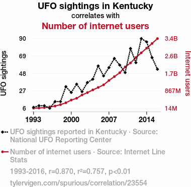 This means 75.7% of the change in the one variable (i.e., Number of internet users) is predictable based on the change in the other (i.e., UFO sightings in Kentucky) over the 24 years from 1993 through 2016.