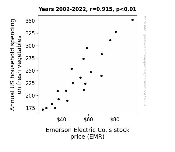 This means 83.8% of the change in the one variable (i.e., Emerson Electric Co.'s stock price (EMR)) is predictable based on the change in the other (i.e., Annual US household spending on fresh vegetables) over the 21 years from 2002 through 2022.