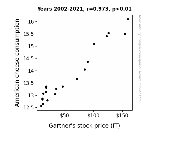 This means 94.6% of the change in the one variable (i.e., Gartner's stock price (IT)) is predictable based on the change in the other (i.e., American cheese consumption) over the 20 years from 2002 through 2021.