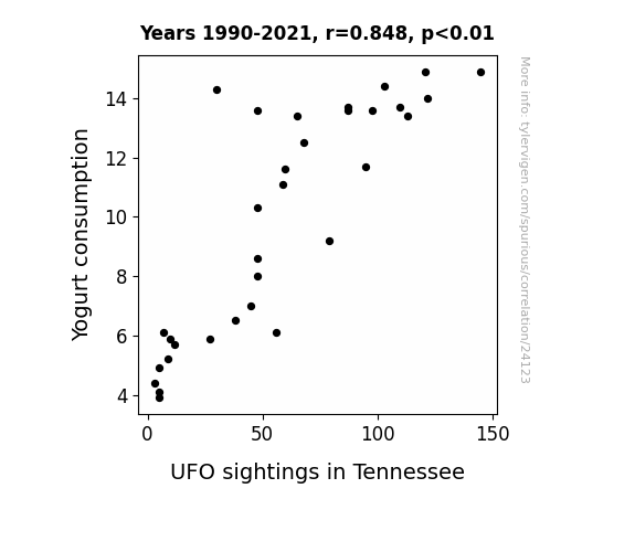 This means 71.9% of the change in the one variable (i.e., UFO sightings in Tennessee) is predictable based on the change in the other (i.e., Yogurt consumption) over the 32 years from 1990 through 2021.