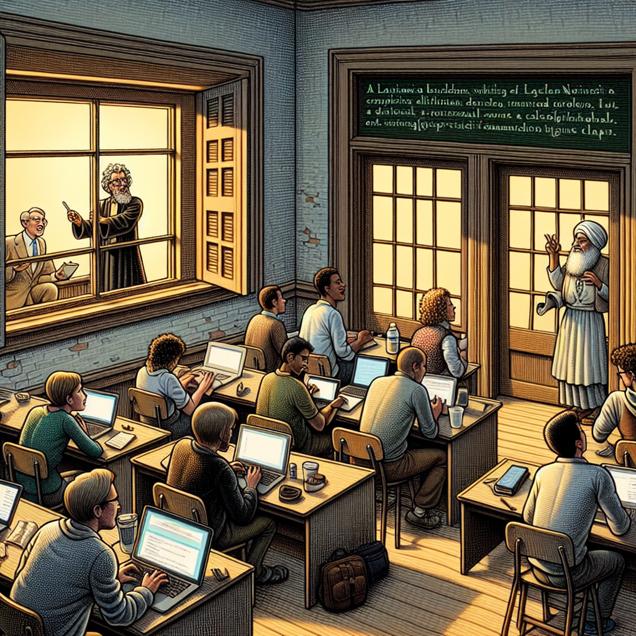 ChatGPT: [ Whimsical illustration ] Generate an image of a cozy classroom at a university in Louisiana. In the classroom, a group of students sits engaged in a lively discussion while the professor, along with several colleagues, passionately delves into deep existential questions related to philosophy and religion. They are preparing for an upcoming conference. Meanwhile, outside the window, someone is joyfully searching on their laptop for "please clap" on Google, seeking a virtual pat on the back after a heated debate. Capture the whimsical essence of the scene with an artistic touch to the classroom setting and the interaction between the characters. Highlight the cheerful curiosity of the person outside the window as they search for a simple affirmation in the midst of intellectual exploration.
