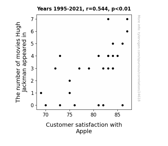This means 29.6% of the change in the one variable (i.e., Customer satisfaction with Apple) is predictable based on the change in the other (i.e., The number of movies Hugh Jackman appeared in) over the 27 years from 1995 through 2021.