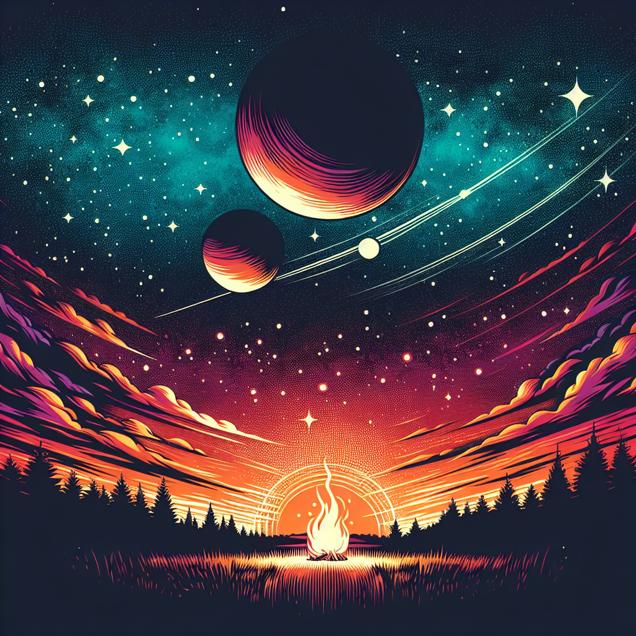 Prompt: Generate an image displaying a vast, starry sky with Uranus and Venus slowly drifting apart in the background, accompanied by the silhouette of North Dakota's tranquil countryside. In the foreground, a flickering flame bursts to life, casting a warm glow and creating a stark contrast against the cosmic backdrop. Ensure that the composition captures the sense of cosmic tension and the unexpected impact of celestial shifts on earthly events, all rendered in a striking [ Data cyber art ] style. The depiction should include only scenes, people, and objects, it should not include text or speech bubbles.