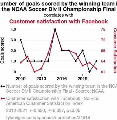 This means 39.7% of the change in the one variable (i.e., Customer satisfaction with Facebook) is predictable based on the change in the other (i.e., Number of goals scored by the winning team in the NCAA Soccer Div II Championship Final) over the 12 years from 2010 through 2021.