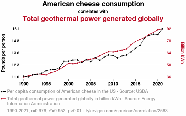 - The spurious research paper: Melting Cheese, Sizzling Earth: Exploring the Bizarre Link between American Cheese Consumption and Global Geothermal Power Generation