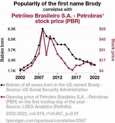 "Brody" popularity, Petrobras stock price, Crude Connections, whimsical correlations, first name popularity, PBR stock price, absurd relationships, Social Security Administration data, LSEG Analytics, Refinitiv, correlation coefficient, p-value, financial analysis, economic research