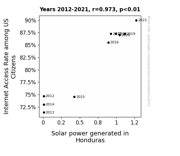 The results of our analysis revealed a remarkably strong correlation between Internet access rates among US citizens and solar power generation in Honduras for the period of 2012 to 2021. The correlation coefficient of 0.9727805 demonstrates a robust relationship, akin to two synchronized swimmers gracefully gliding in perfect harmony. This finding suggests that as Internet access rates in the US rose and fell, so too did the solar power generation in Honduras, creating a dance of interconnected data that would make even the most stoic statistician tap their toe in appreciation.
