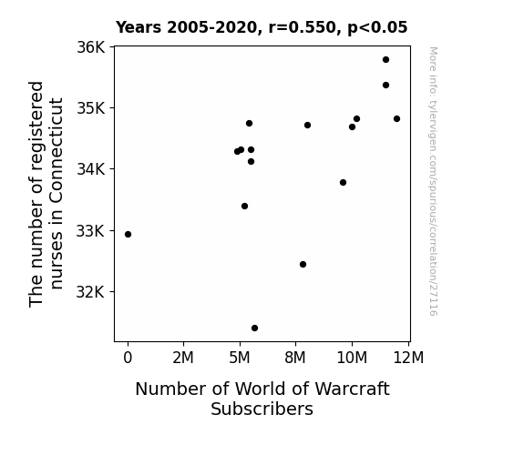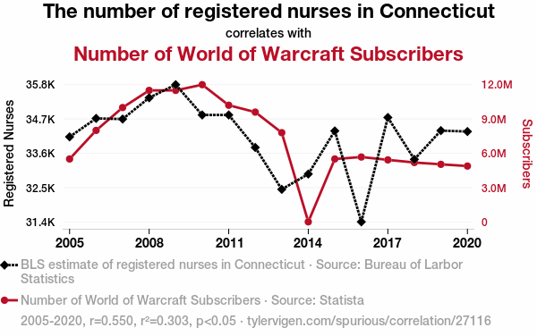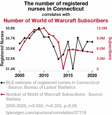 This means 30.3% of the change in the one variable (i.e., Number of World of Warcraft Subscribers) is predictable based on the change in the other (i.e., The number of registered nurses in Connecticut) over the 16 years from 2005 through 2020.