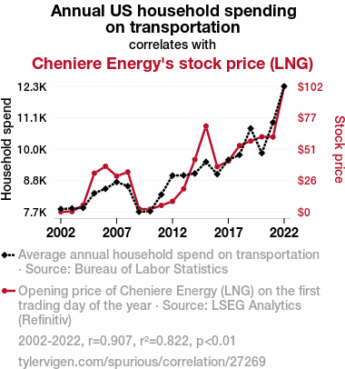 This means 82.2% of the change in the one variable (i.e., Cheniere Energy's stock price (LNG)) is predictable based on the change in the other (i.e., Annual US household spending on transportation) over the 21 years from 2002 through 2022.