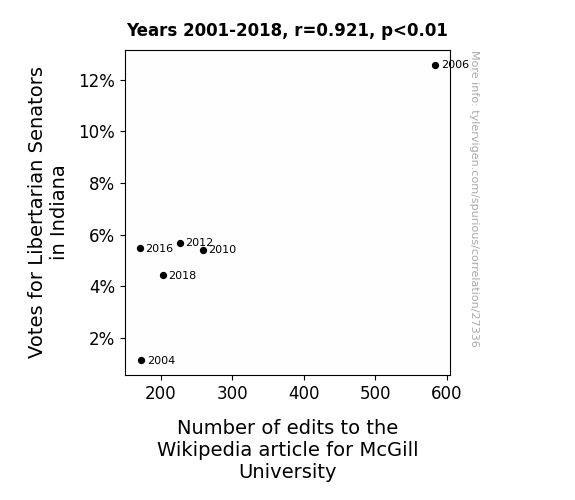 This means 84.9% of the change in the one variable (i.e., Number of edits to the Wikipedia article for McGill University) is predictable based on the change in the other (i.e., Votes for Libertarian Senators in Indiana) over the 6 years from 2001 through 2018.