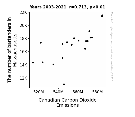 This means 50.9% of the change in the one variable (i.e., Canadian Carbon Dioxide Emissions) is predictable based on the change in the other (i.e., The number of bartenders in Massachusetts) over the 19 years from 2003 through 2021.