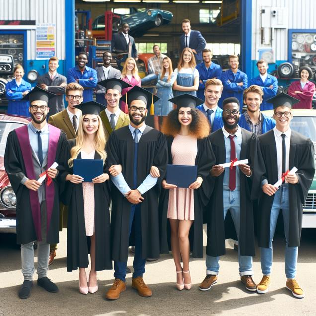 ChatGPT: A group of smiling graduates in public administration and social services are seen holding their diplomas at a university campus. Behind them, a line of shiny cars is forming at an auto repair shop, with a team of automotive technicians ready to assist. The graduates look excited to join the workforce and make a positive impact on their community, while the technicians are eager to put their skills to work.