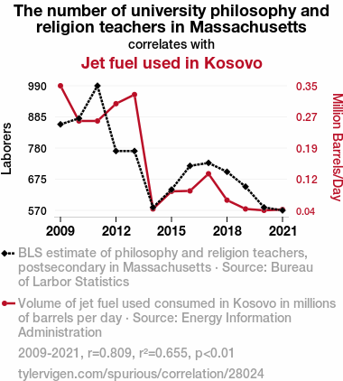 This means 65.5% of the change in the one variable (i.e., Jet fuel used in Kosovo) is predictable based on the change in the other (i.e., The number of university philosophy and religion teachers in Massachusetts) over the 13 years from 2009 through 2021.