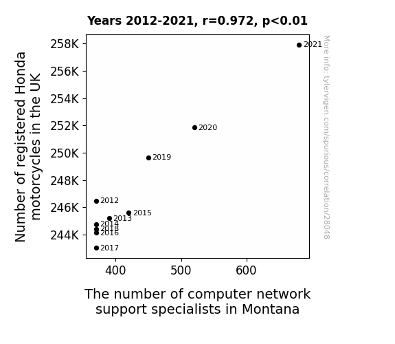 This means 94.4% of the change in the one variable (i.e., The number of computer network support specialists in Montana) is predictable based on the change in the other (i.e., Number of registered Honda motorcycles in the UK) over the 10 years from 2012 through 2021.