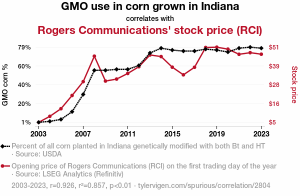 - The spurious research paper: Cross-Pollinating Stock Market Trends: The Corny Connection Between GMO Usage in Indiana and RCI Stock Price
