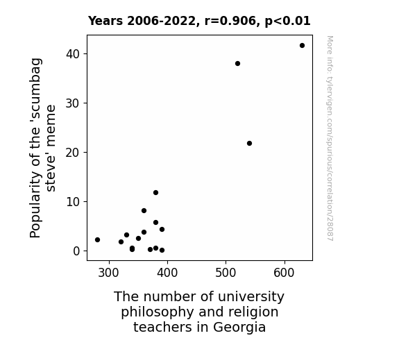 This means 82% of the change in the one variable (i.e., The number of university philosophy and religion teachers in Georgia) is predictable based on the change in the other (i.e., Popularity of the 'scumbag steve' meme) over the 17 years from 2006 through 2022.