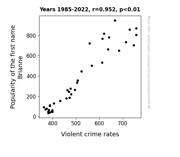 This means 90.6% of the change in the one variable (i.e., Violent crime rates) is predictable based on the change in the other (i.e., Popularity of the first name Brianne) over the 38 years from 1985 through 2022.