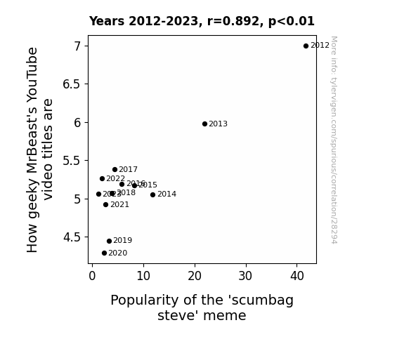 This means 79.6% of the change in the one variable (i.e., Popularity of the 'scumbag steve' meme) is predictable based on the change in the other (i.e., How geeky MrBeast's YouTube video titles are) over the 12 years from 2012 through 2023.