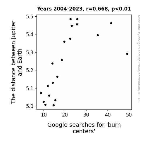This means 44.6% of the change in the one variable (i.e., Google searches for 'burn centers') is predictable based on the change in the other (i.e., The distance between Jupiter and Earth) over the 20 years from 2004 through 2023.
