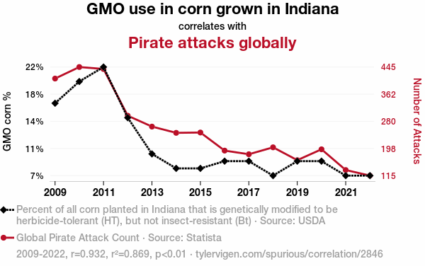 - The spurious research paper: Unraveling the Kernel of Truth: Investigating the Correlation Between GMO Corn Production in Indiana and Global Pirate Attacks