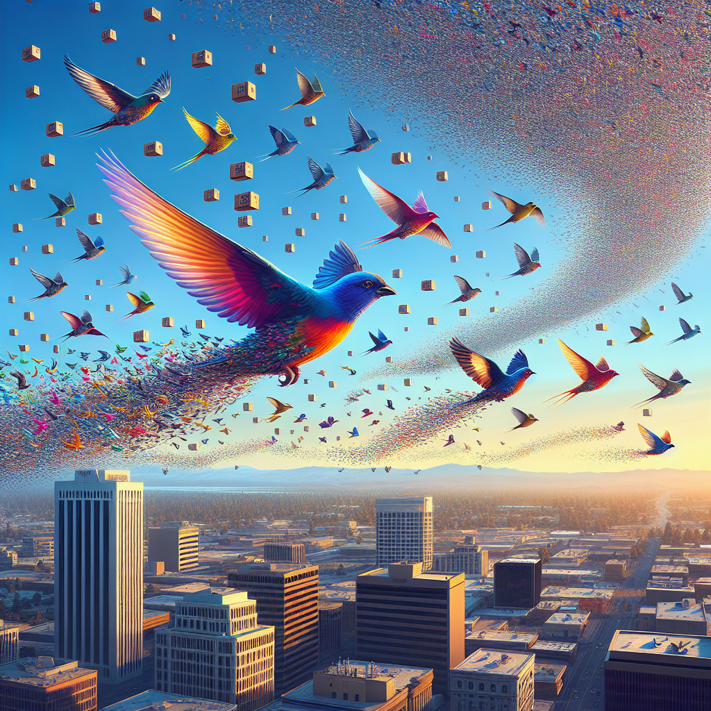 Prompt: [ A photo-realistic image ] of a clear and vibrant sky over Sacramento, with a flock of colorful birds gracefully soaring through the air, alongside physical album shipments being gently carried by ambitious birds. The scene conveys the harmony and natural balance of reducing air pollution, allowing birds to soar, while also capturing the whimsical notion of birds being drawn to physical album shipments, leading to a change in their distribution patterns. The depiction should include only scenes, people, and objects, it should not include text or speech bubbles.